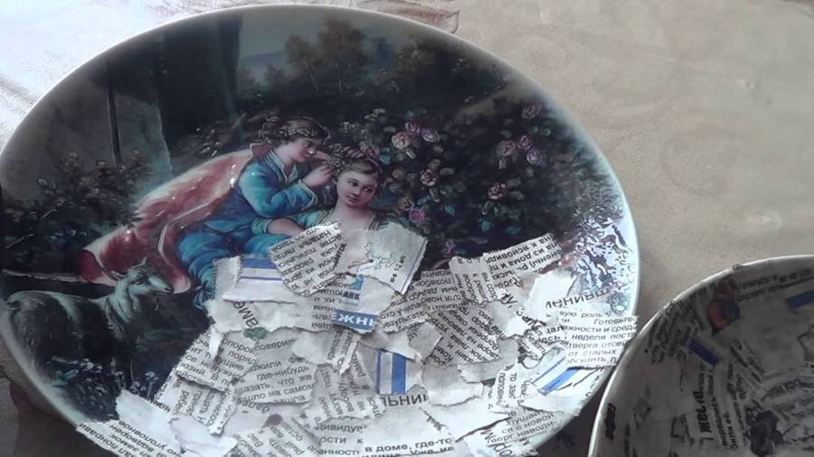 - заранее подготовленные кусочки газеты смачиваются водой и прикладываются к тарелке с внешней стороны (обклеивать внутреннюю часть или делать загнутые края не нужно);