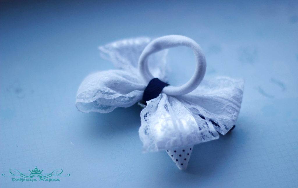 Накладываем бантики друг на друга. Сначала в горошек, на него белый, сверху с кружевом. Сшиваем все слои. Крепим серединку и резинку на фетровом пятачке диаметром 2-2,5 см. У меня получились не только школьные банты, но и галстук.