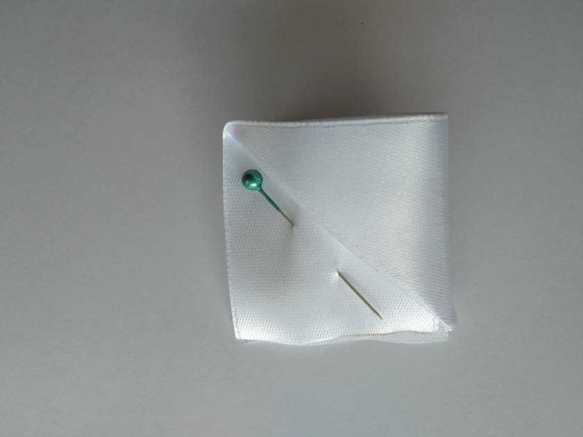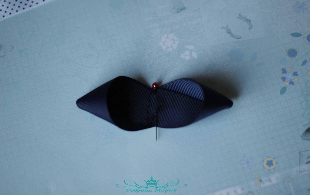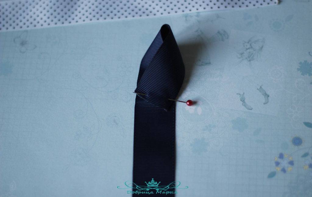 У ленточки намечаем серединку и каждый конец пригибаем к ней с одной стороны. Чтобы вам было удобно, закрепляем их булавочкой в центре. Точно такие же манипуляции проводим со второй ленточкой.