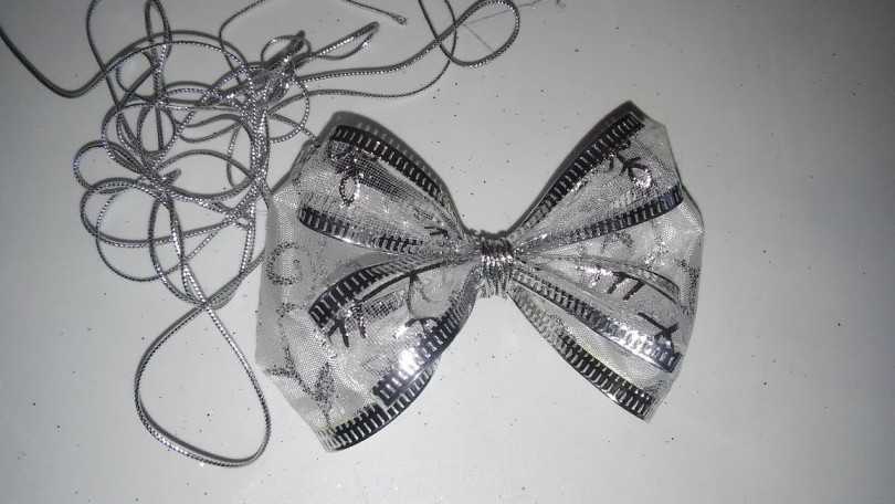 Сделайте еще одну часть банта из четырех красно-золотистых деталей. Вырежьте серебристые отрезки шины. Подготовьте красивые скошенные хвостики.