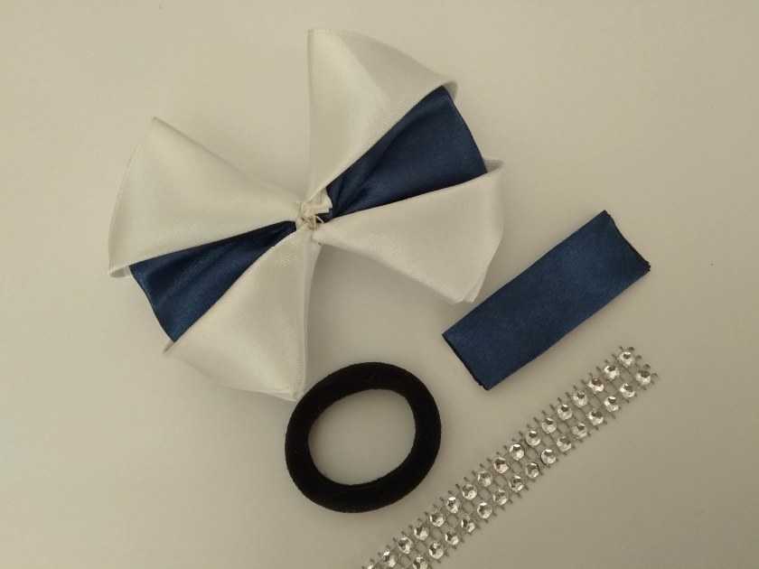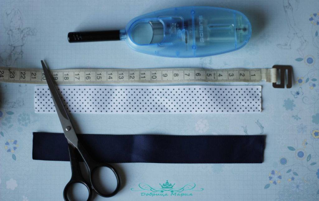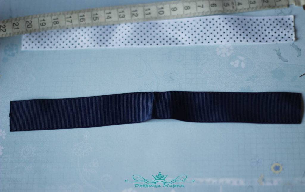 Репсовая 2, 5 см. шириной и 21 см длиной, я взяла разные расцветки, одна белая в мелкий горох, другая темно-синяя. Края у лент опаляем, чтобы они не сыпались и с ними было удобно работать.