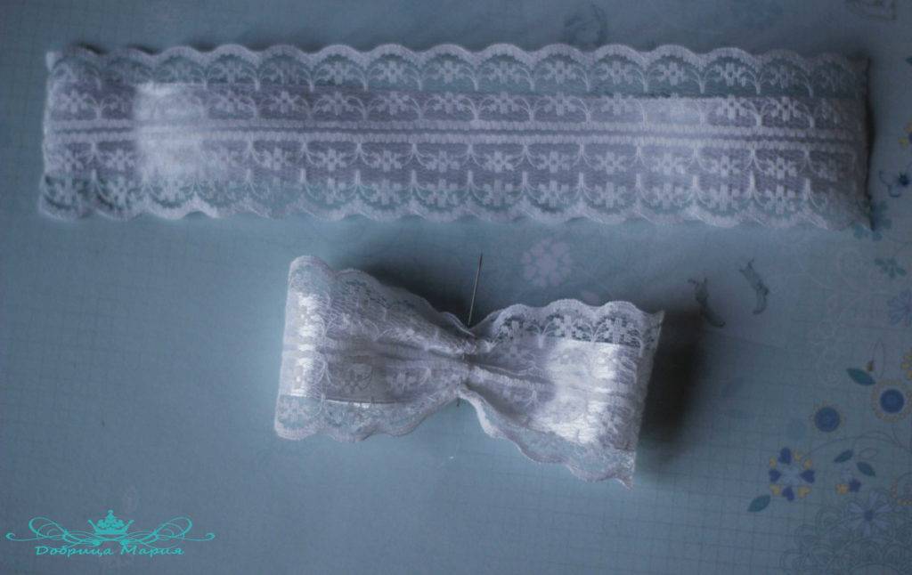 Для нижней части банта берем 2 отрезка кружева 4 см. ширина и 2 отрезка атласной ленты 2,5 см. ширина и длиной все отрезки по 21,5 см.