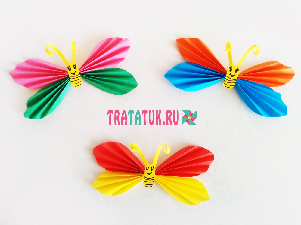 Из сложенной в мелкую гармошку бумаги получаются невероятно красивые бабочки. Их крылышки могут быть разной формы, цвета, что дает ребенку возможность вволю проявить свое творческое видение и фантазию без ущерба внешнему виду бабочки. Поделка состоит из небольшого туловища, вырезанного из картона и крылышек в складочку из цветной бумаги.