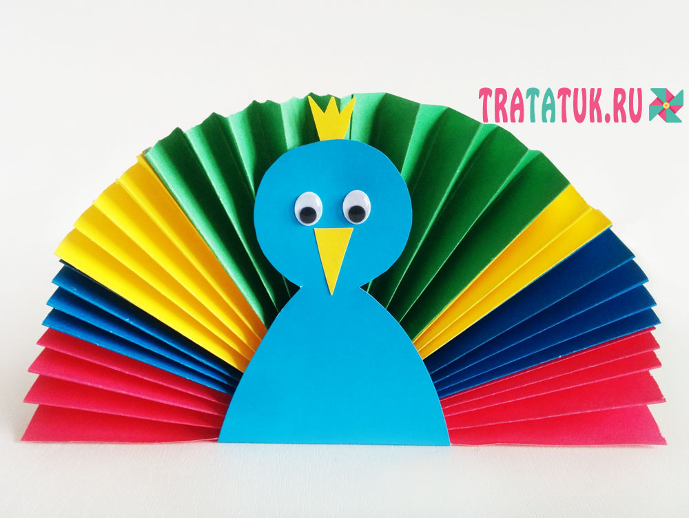 В данной работе техника немного усложнена разноцветностью. Хвост павлина включает различные расцветки для пущей яркости и красоты этой шикарной птицы. Но сделать это совсем не сложно, всего лишь сложить несколько гармошек с цветной бумаги разного цвета, а затем приклеить их друг на друга. Туловище павлина вырезано из плотного картона.
