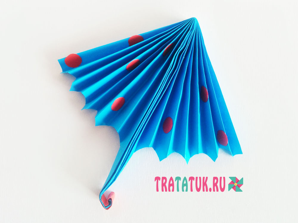 Поделка простая и интересная. А еще ее достоинством является то, что она может быть часть аппликации. Например, дети могут смастерить зонтик, а затем приклеить ее на подготовленный для них рисунок со сказочными персонажами, которых нужно срочно спрятать от дождя, приклеив над ними объемный зонт. Подробнее в статье — зонтик из бумаги гармошкой