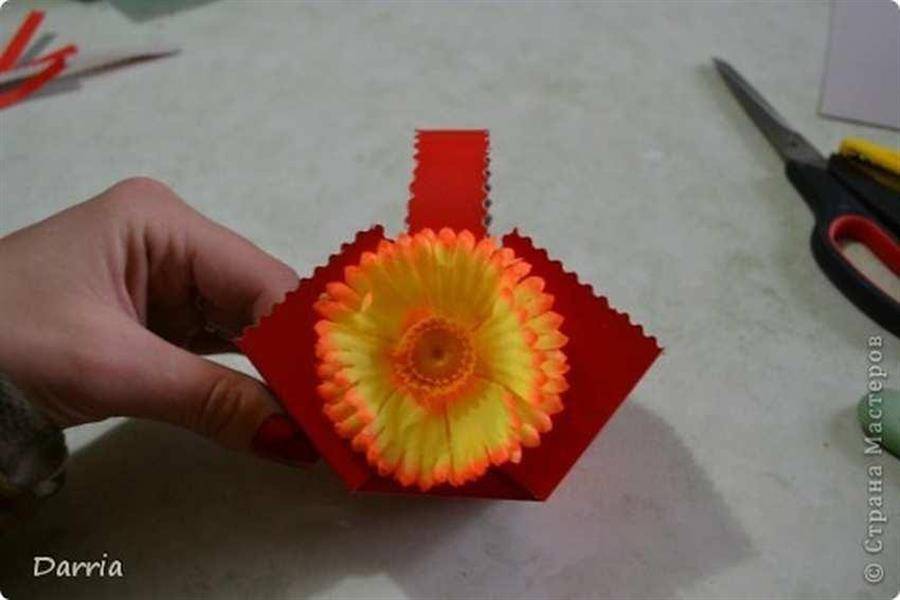 Листочки зеленого цвета можно прикрепить отдельно или расположить под самим цветком. Интересно будет смотреться поделка, где они расположены по обе стороны цветка. Поделка готова! Можно подарить такую корзинку маме на 8 Марта или на День матери.