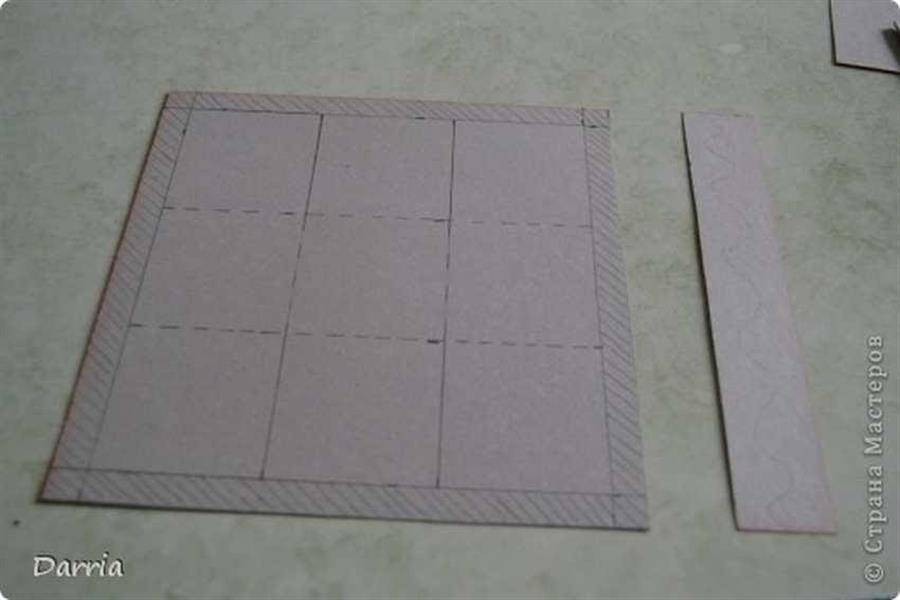 Возьмите лист картона 15 на 18 см. С одной стороны, обклейте его цветной бумагой, а с другой – расчертите как показано на картинке. Вырежьте полоску для ручки размером 3 на 15 см.