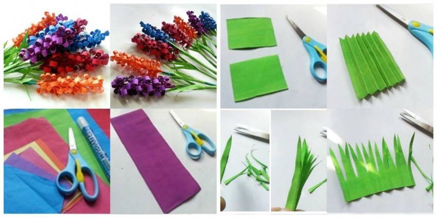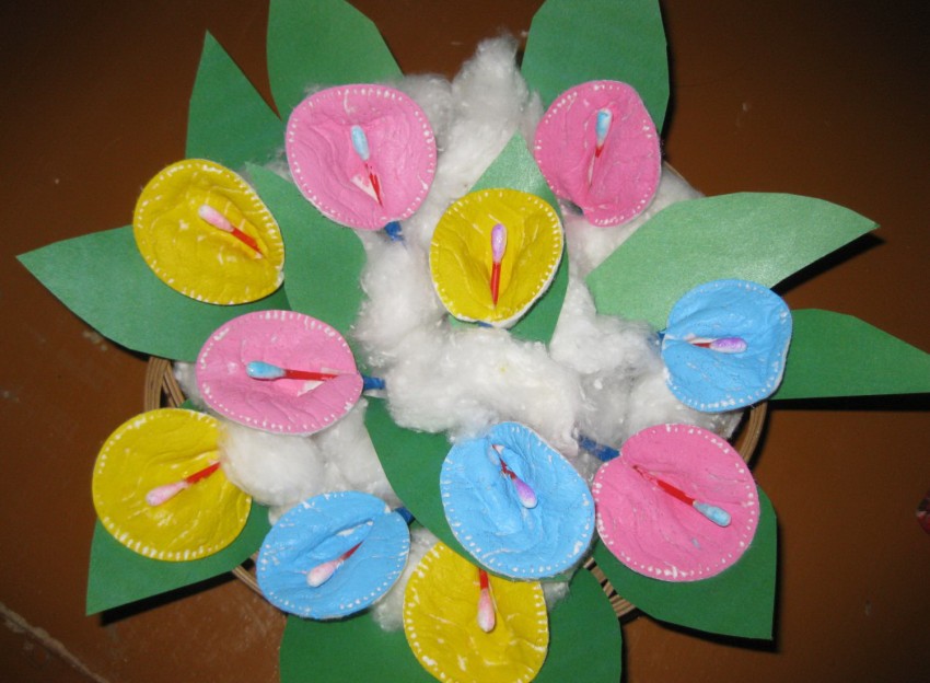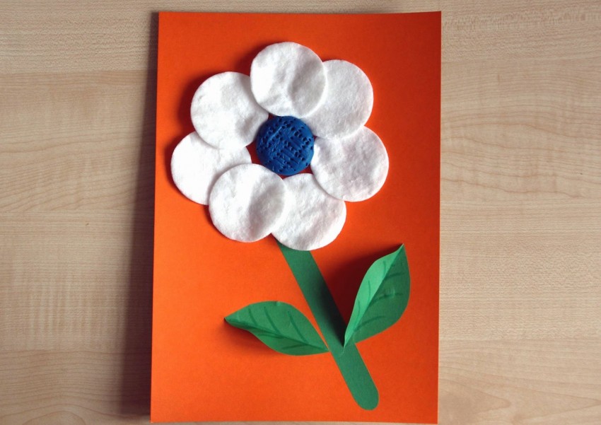 - из картона вырезать стебель, с одной стороны которого приклеить готовую заготовку цветка, с другой – предварительно вырезанную деталь с лепестками;