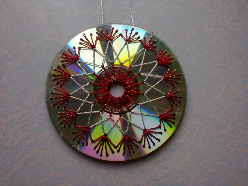 Совет: если в дырочки продеть больше нитей (до 10 штук), то лучики получатся более пышными и объемными.