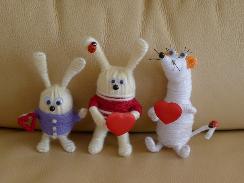 Замечательные поделки-игрушки своими руками шьют, используя ткань. Причем, не только цельного отреза, а различных лоскутков, хозяйственных салфеток и даже носков. Посмотрите на фото, не правда ли, симпатичный зайчик получился из носка? Ребенок по старше вполне сделает его самостоятельно, а малышу придется помочь. Сделайте необходимые разрезы и швы, а ребенку поручите плотно набить фигурку, а также нарисовать мордочку.