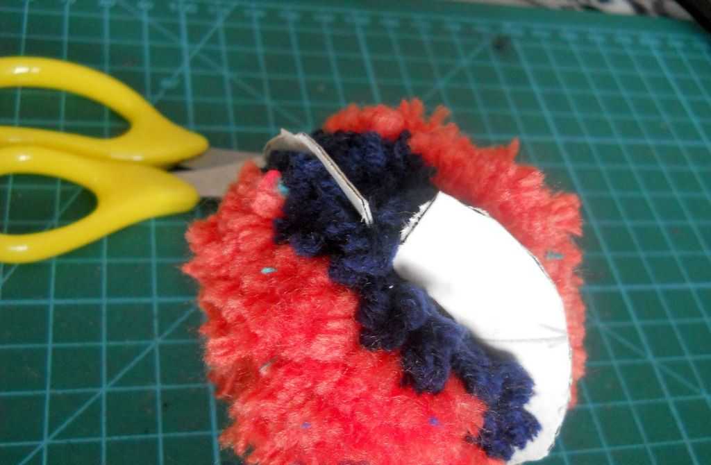 После того как закончите обматывать заготовки из картона, нужно разрезать нитки ножницами по месту смыкания кругов между собой