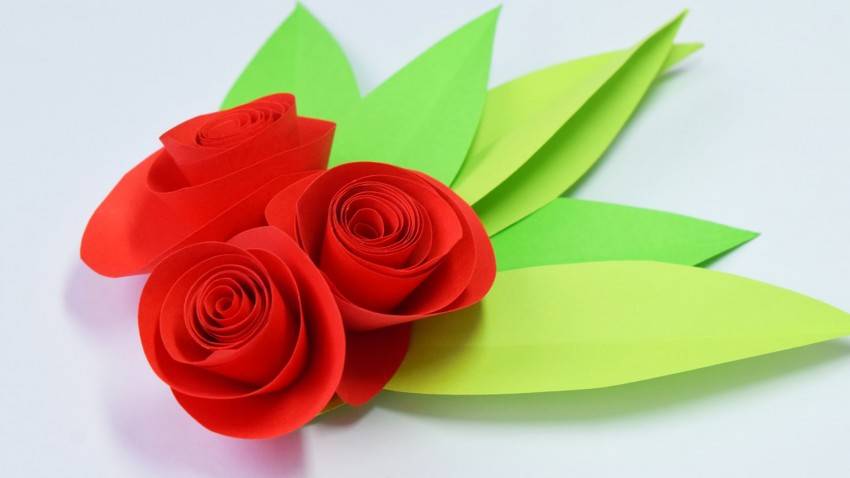 Вы хотите сделать объемную розочку из бумаги, но у вас ограничено время на поделку? Тогда этот вариант изделия придется вам по душе. Как изготовить цветок? Поделка будет состоять из трех ярусов и для ее изготовления вам понадобятся три разных по размеру квадратных заготовки. Желательно для создания цветка выбирать двухстороннюю бумагу, чтобы ваша поделка выглядела привлекательно не только с лицевой, но и с оборотной стороны. Как изготовить розу? Сложите каждую из квадратных заготовок пополам, а затем еще раз пополам. У вас должен получиться небольшой квадрат. Теперь согните квадрат по диагонали и сделайте один из острых углов геометрической фигуры скругленным. Нижний угол тоже следует отрезать. Разверните ваши заготовки. У вас должны получиться цветочки с лепестками разных размеров. С помощью ножниц накрутите каждый лепесток, а затем соберите все модули в единую конструкцию.