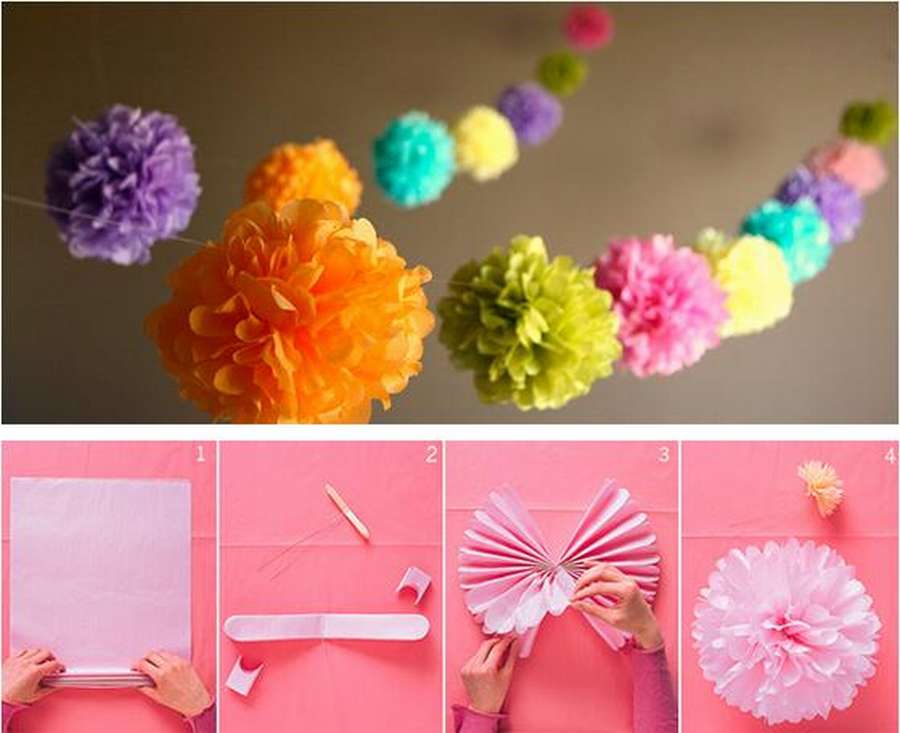 Гирлянда из объемных цветов своими руками, это просто. Нарезаем гофрированную бумагу, складываем в стопки, потом в гармошку, разворачиваем и распушаем.