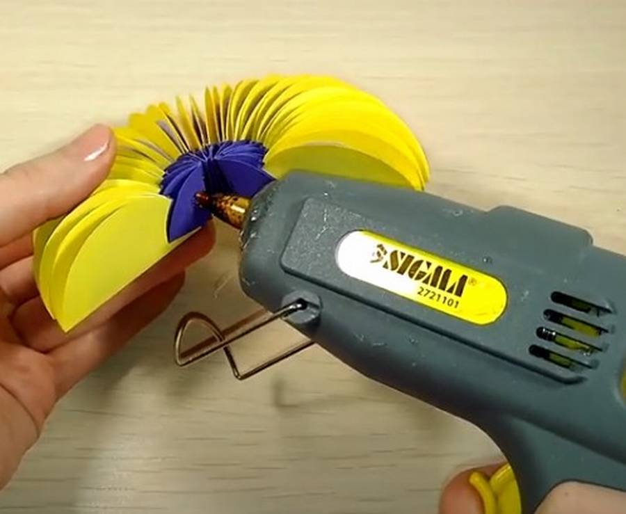 Лепестки крепятся друг к другу клеем. И сами по себе собираются при помощи клея. Поэтому, если будете писать что-то на листочках, выбирайте самый крупный элемент лепестка. Его потом можно будет срезать ножницами и зачитывать. Отличный вариант поделки на классном часе или для предпраздничного мастер – класса. Букет таких необычных цветов будет очень красиво выглядит в вазе.