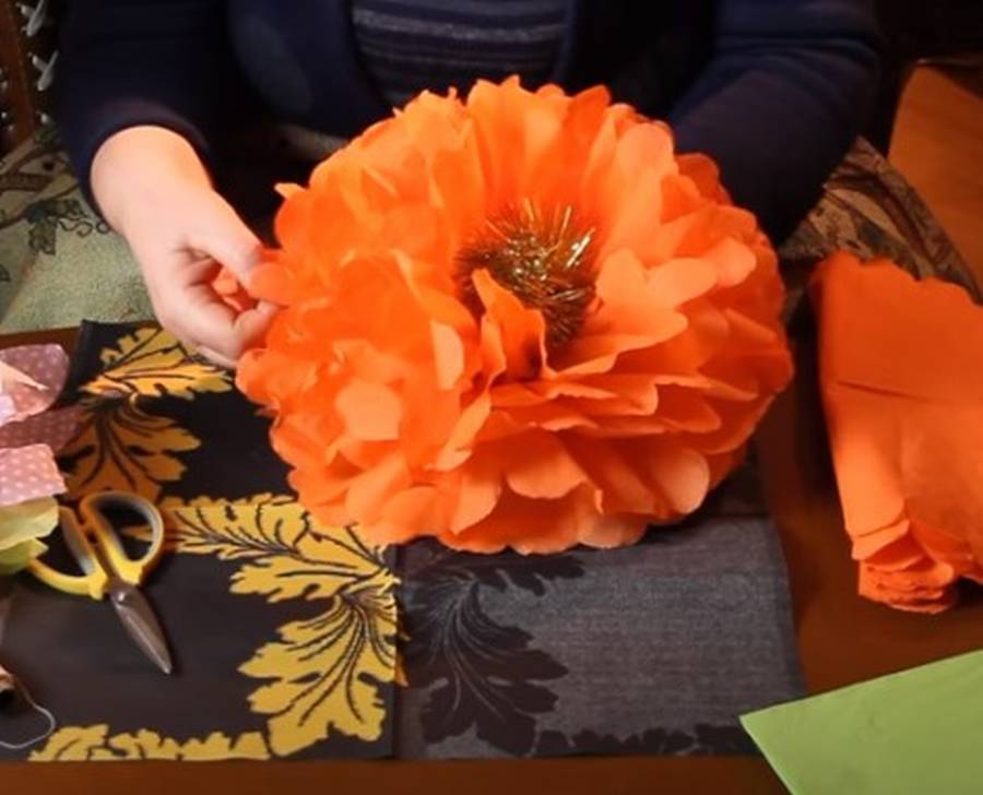 Как красиво автор оформляет объемный цветок из бумаги, делает его пышным и красивым. Для изготовления можно взять бумажную салфетку, с особым принтом или просто однотонную. Салфетку нужно брать большого размера, иначе цветок получится маленьким. В последствии, кога автор пушит цветок, она аккуратно проводит руками между лепестков.