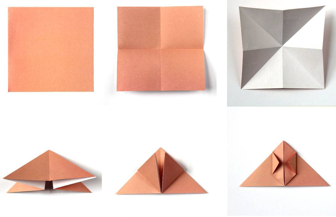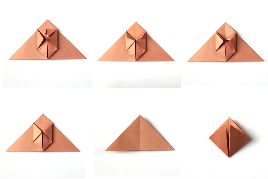 Оранжевый двухсторонний лист квадратной формы складываем пополам в диагональном направлении. У полученного треугольника загибаем вверх нижние углы. Раскрываем заготовку.
