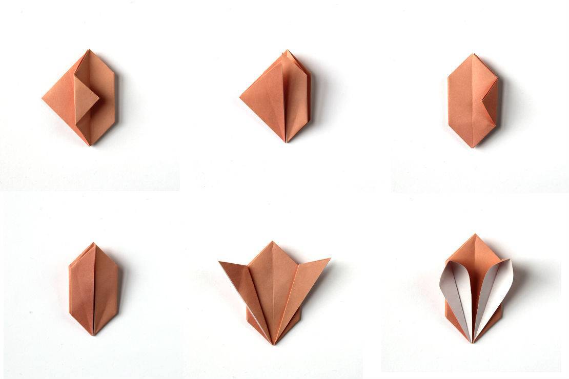 - Переворачиваем заготовку. Внешние углы складываем вверх вдоль центральной линии. Получаем ромб.