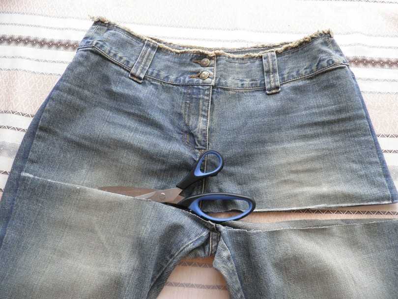 - Джинсы обрезают со сторон в соответствии с запланированной высотой изделия.