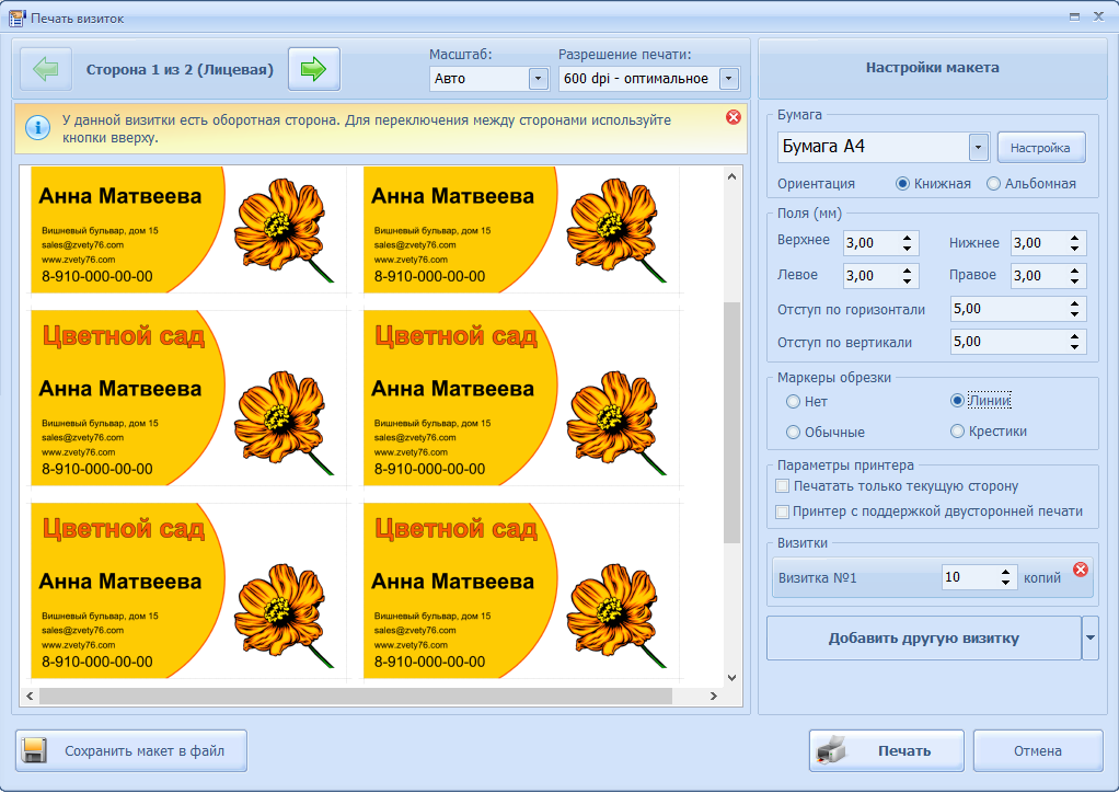 Перейдите в меню «Печать». Далее, выберите тип разрешения и формат бумаги. Затем укажите количество карточек, которое вы планируете расположить на листе. Установите размер полей и маркеры обрезки. После завершения всех настроек, кликните на кнопку «Печать». Распечатать визитки можно на разных принтерах (лазерных и струйных), а также на полиграфических устройствах.