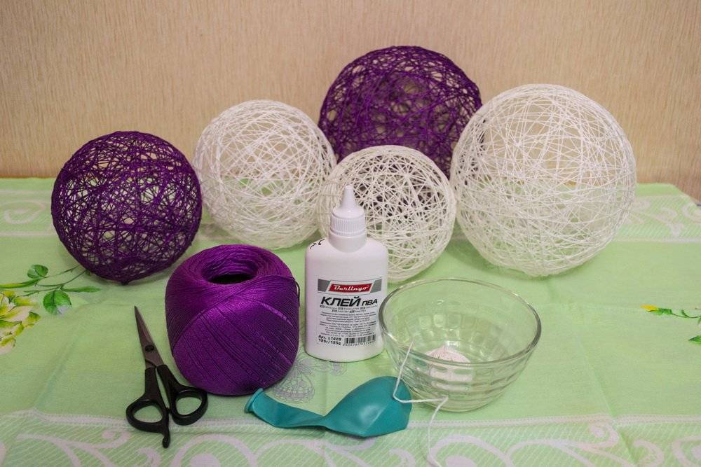 Перед изготовлением своего первого шара и многих мастериц возникает вопрос: какие нитки брать. Лучше всего делать шар из хлопковых, достаточно толстых ниток, так как они хорошо склеиваются между собой. Смесовую пряжу тоже можно взять, но выбирайте гладкую, а не ворсистую (то есть без содержания ангоры или шерсти). Маленькие шары можно делать даже из простых ниток мулине. Цвет материала может быть любой. При желании уже готовое изделие можно покрасить краской из баллончика.