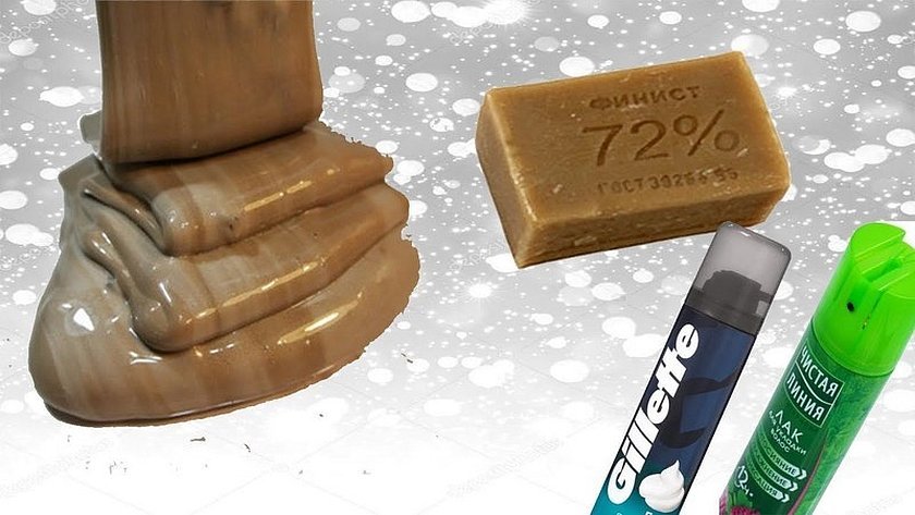 Первый способ — из простой пены для бритья. Это один из классических примеров, включающий в себя довольно простые составляющие: полимер и загуститель. Их выбор зависит от фантазии.