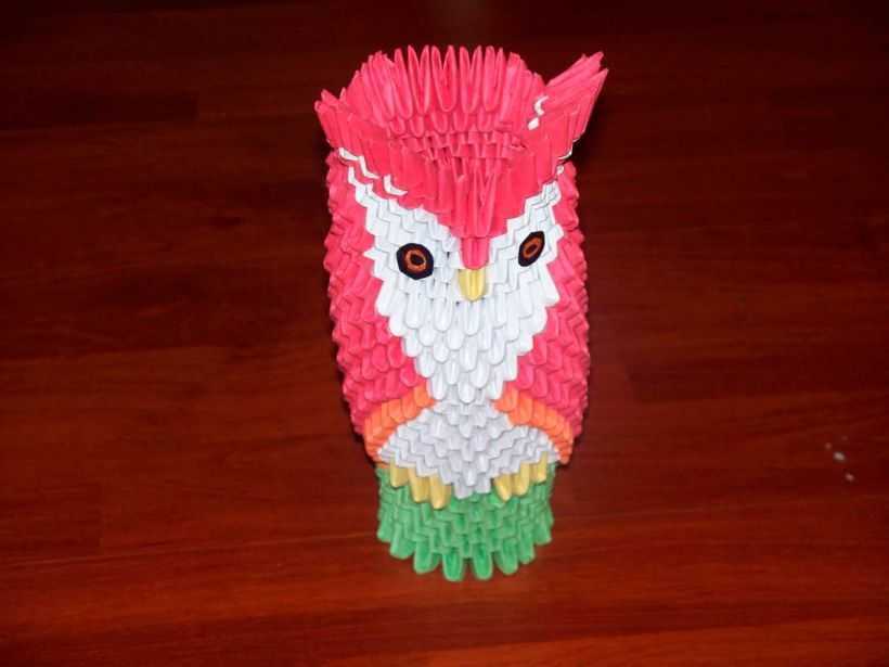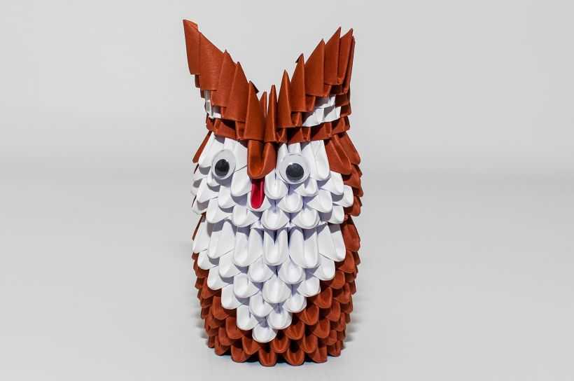 Техника модульного оригами предполагает создание разнообразных фигур путем складывания модулей, т.е. маленьких элементов из бумаги. В некоторых случаях их количество может составлять сотни, а то и тысячи мелких деталей, особенно для поделок в формате 3D. На фото отлично видно, из каких элементов состоит сова оригами.