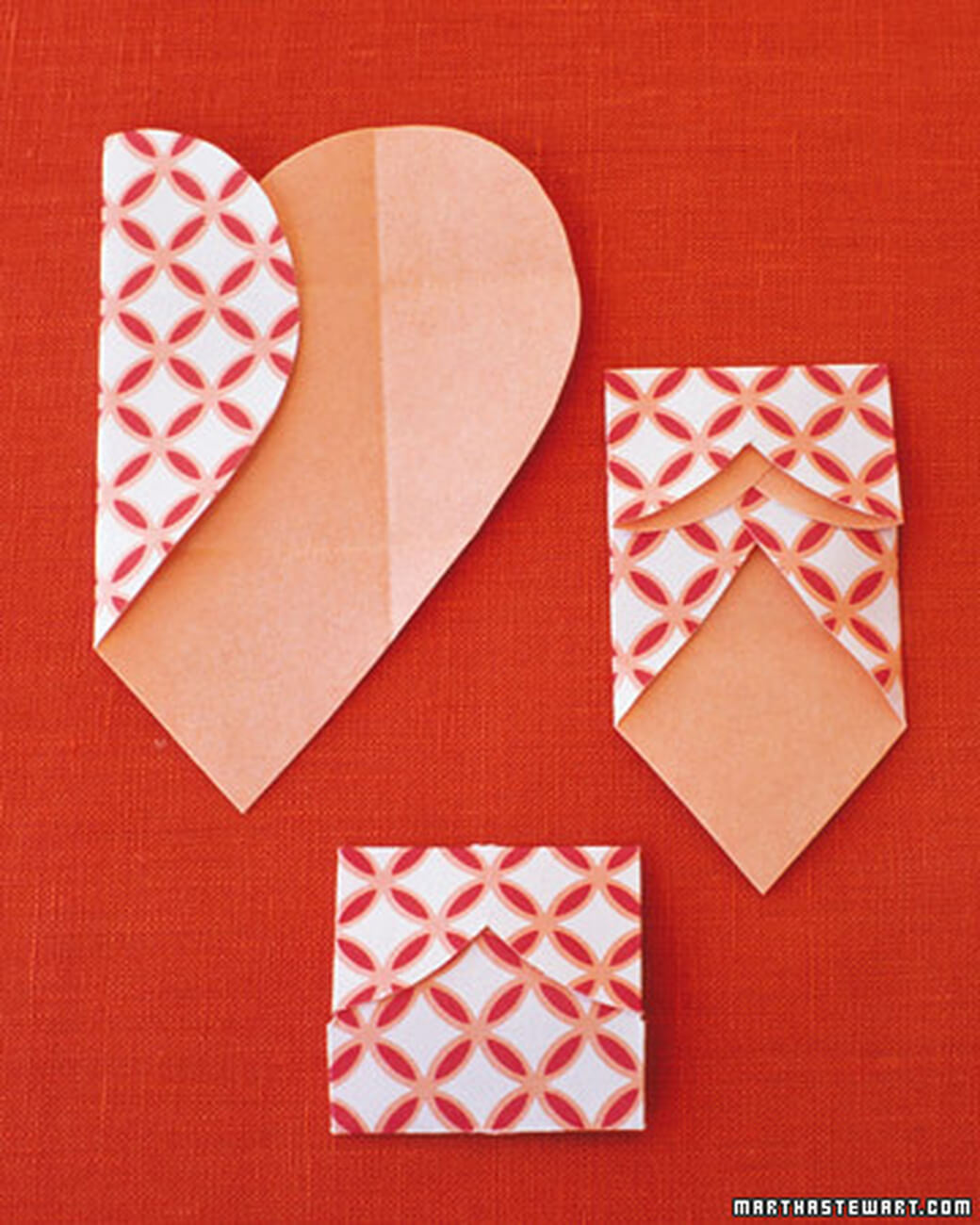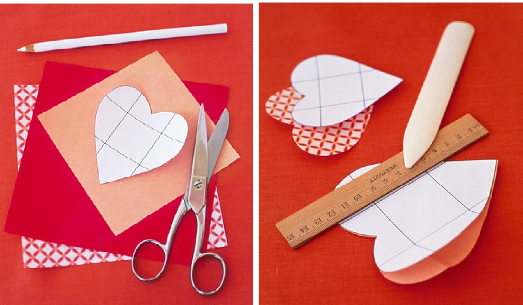 Контур сердца переносят на бумагу карандашом и вырезают. Прикладывают трафарет к бумаге, и с помощью острого предмета намечают линии. Заготовку складывают.