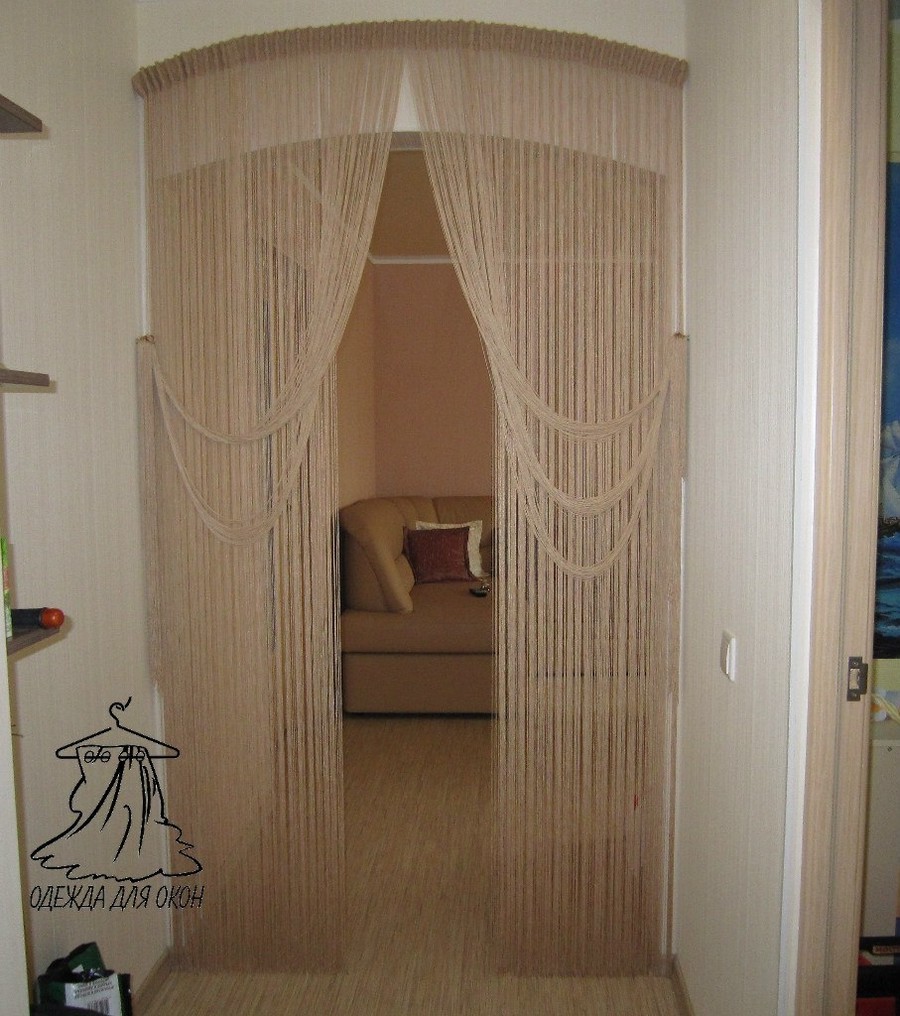 Нитяные штор бежевого цвета, выполненные своими руками, делают проход визуально выше, за счет высоко расположенного карниза