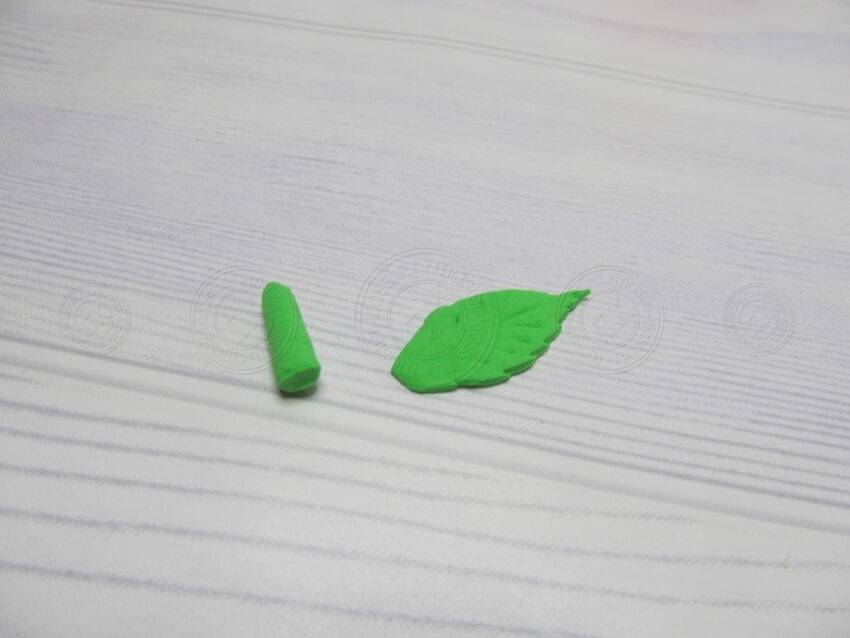 12. Из пластилина того же цвета скатаем еще одну колбаску, с прямым и ровным основанием, и скругленным верхом. Вторая деталь — это лист, который проще вырезать ножом из плоского листа материала. Когда закончите, изобразите на нем текстуру в виде продольных линий.