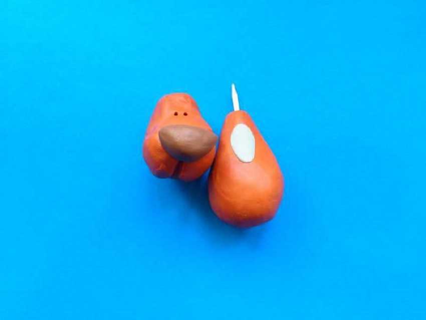 2. Начинайте собирать животное, соединив туловище и голову, вытяните переднюю часть корпуса в виде шеи. Спичка поможет сделать поделку крепкой. Переднюю часть мордочки заострите, чтобы получился нос.