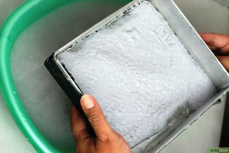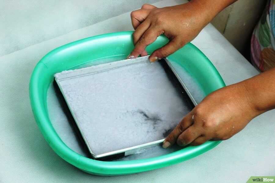 Смесь еще раз взбивается до однородного состояния, напоминающего по консистенции кашу. Массу нужно аккуратно вычерпать рамкой. Смесь максимально равномерно распределяется по рамке. После этого с нее нужно удалить лишнюю влагу при помощи губки или старых газет. Затем масса переносится на ткань и сушится в течение нескольких дней.