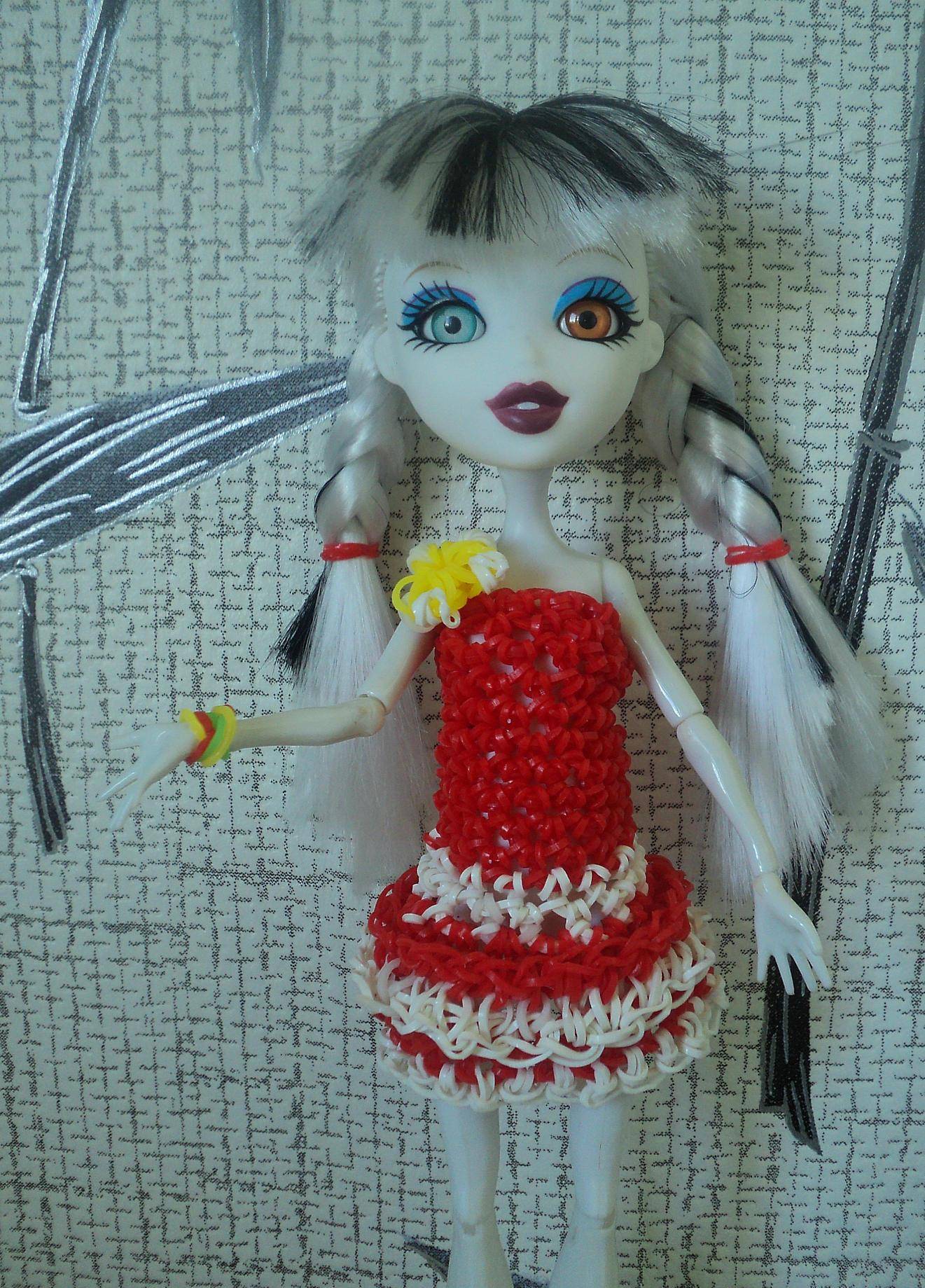 Красивая нарядная одежда из резинок для кукол готова! Изучив этот небольшой мастер класс, вы сможете сплести еще парочку платьев такого же фасона, но уже другого цвета и длины!