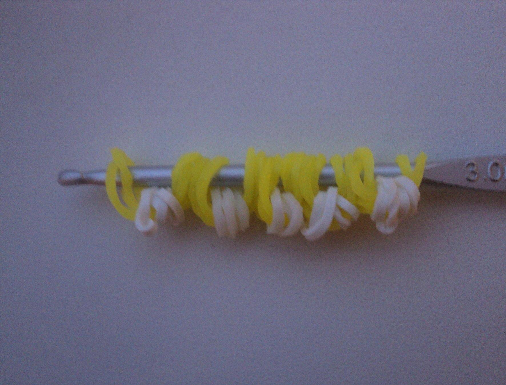 - На крючок надевают радужку белого цвета в три оборота. Затем берут белое колечко, складывают вдвое, цепляют за край и скидывают на него тройную. Отодвигают подальше на крючок.
