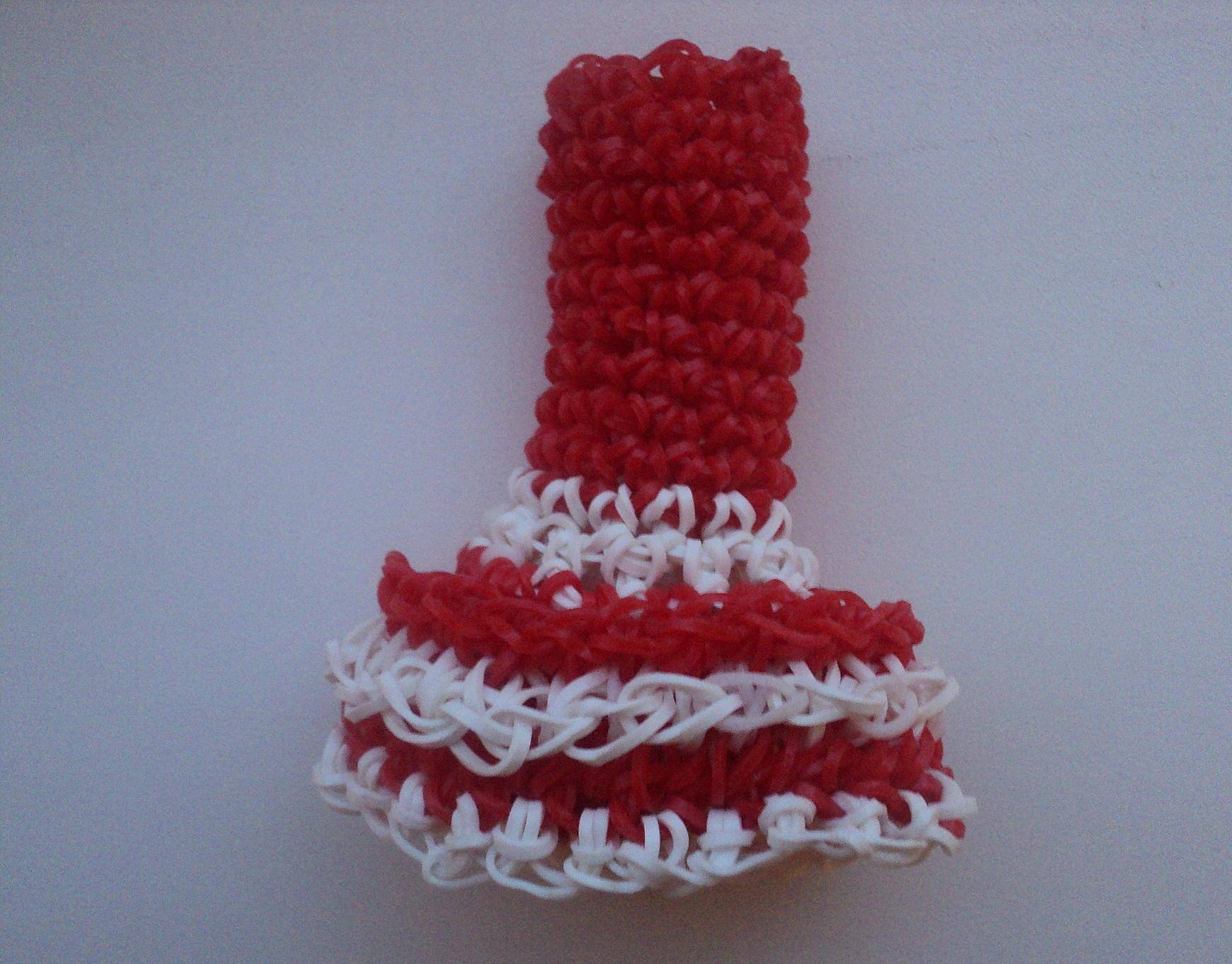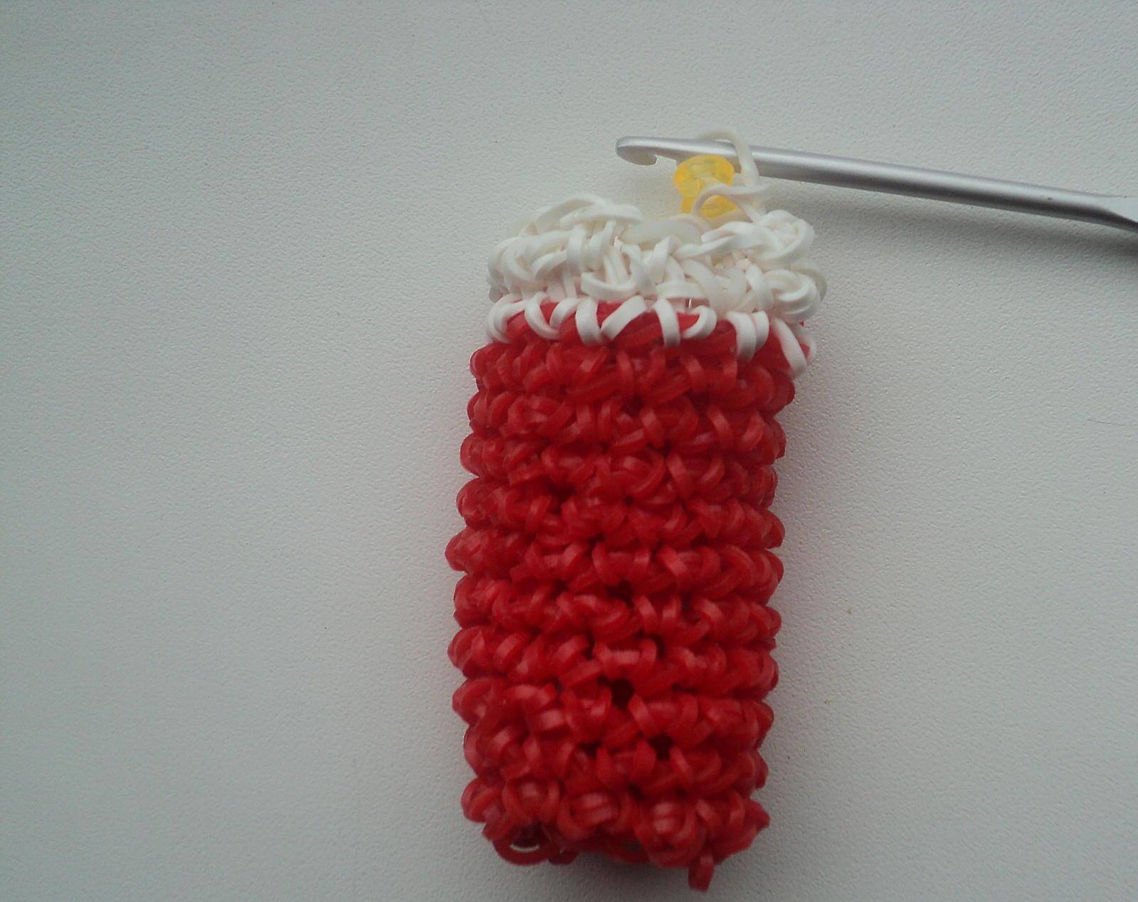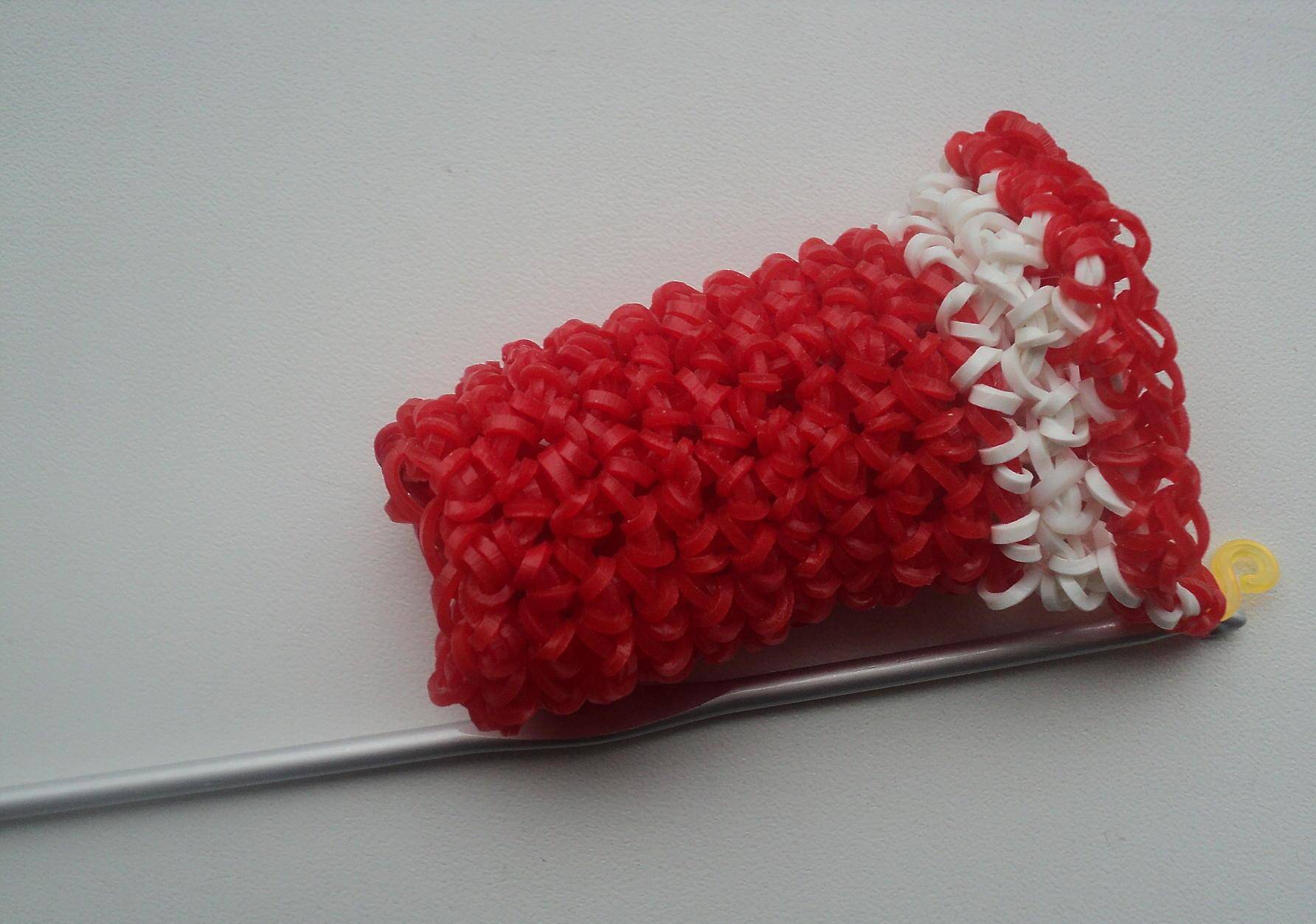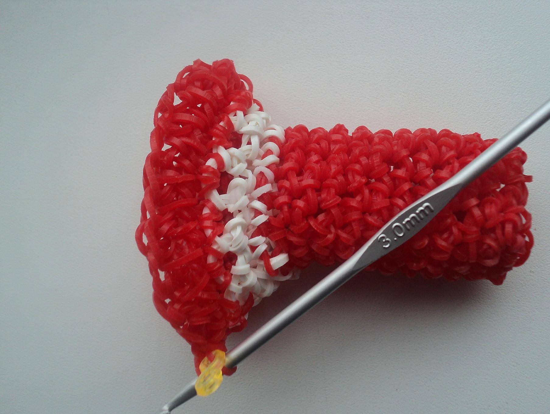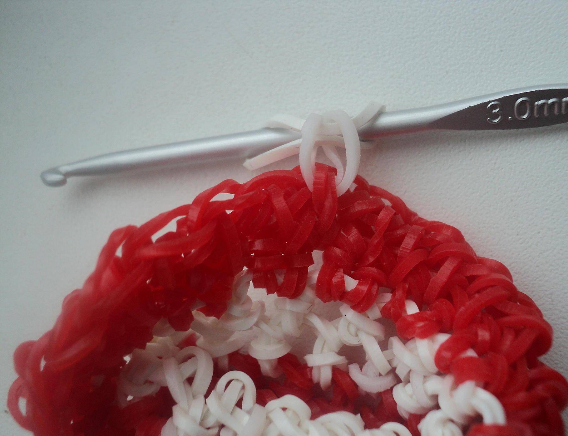 Готовую цепочку из резинок мы должны соединить в круг. Для этого нужно ввести крючок в первую резинку, и протянув ее через все петли, сформировать узелок. После этого мы продолжаем плести по кругу, при этом заводим рабочий инструмент в каждую петельку по 1 разу. Получается, что прибавок во время работы мы не делаем. Красными резинками необходимо сформировать 11 рядов. Следующие 2 ряда плетем белыми.