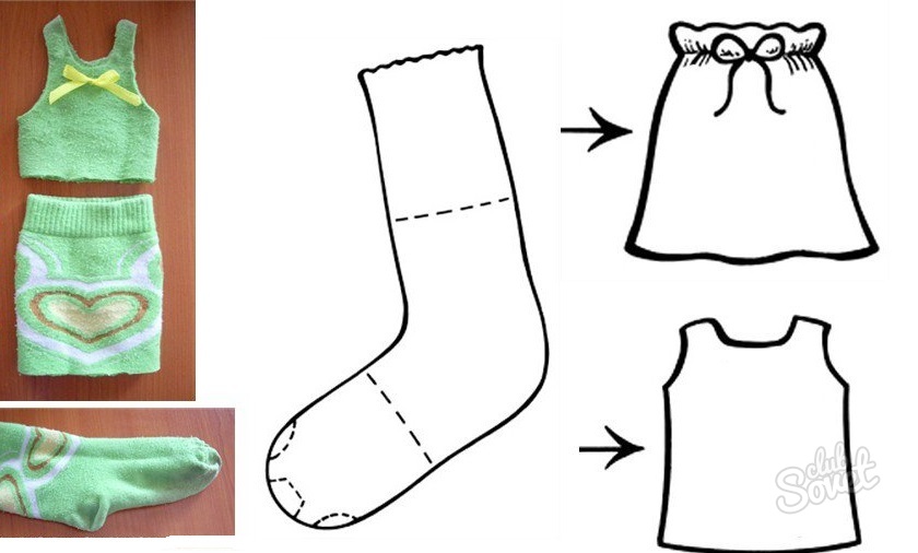 - Нижняя часть будет использоваться для топа, а верх носочка ― для юбочки.