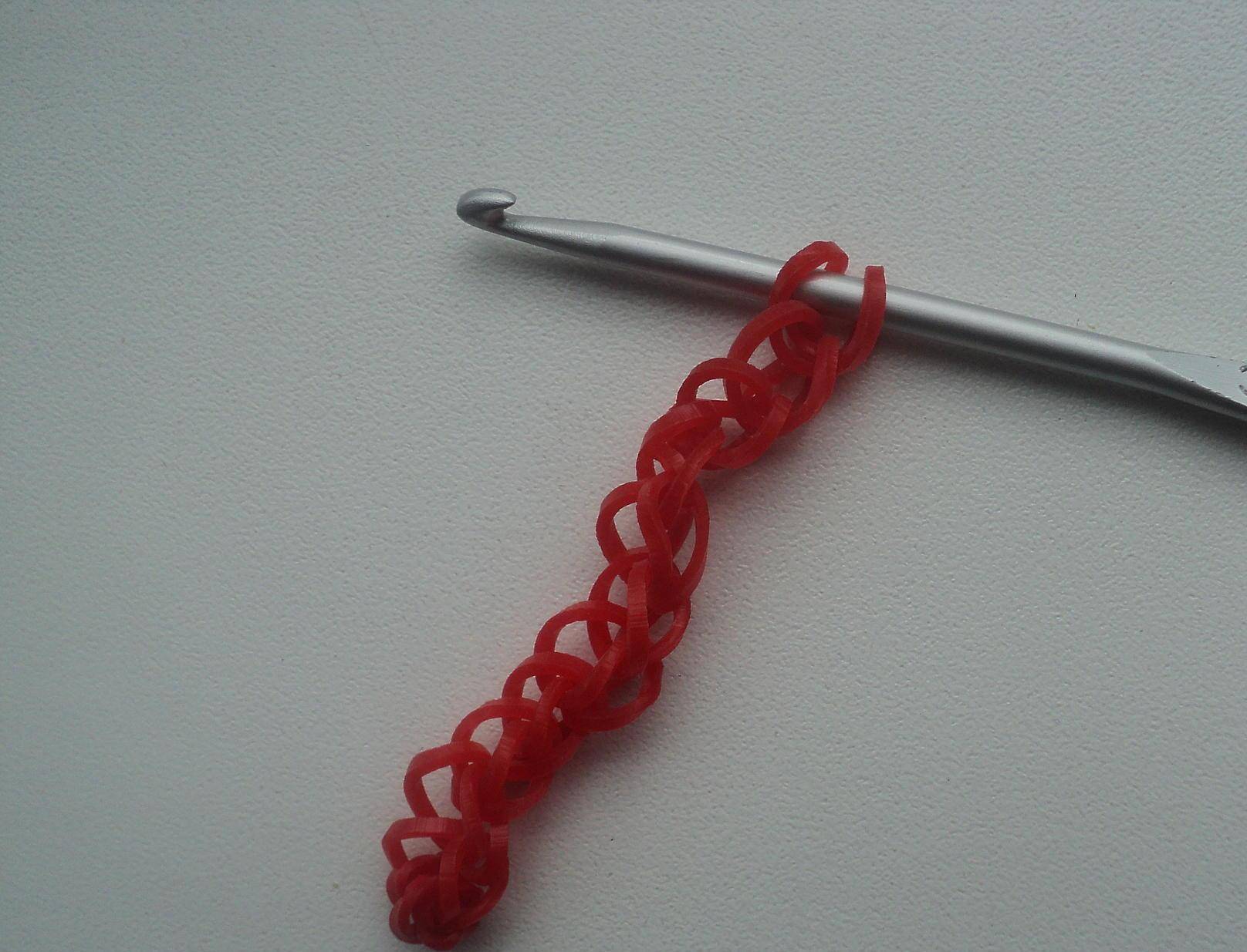 Дальше берут белую, не перекручивают ее. Крючком поднимают белую и закладывают на красную, а затем со второго столбика закладывают так же. После 5-6 переплетов крючком поддевают конец браслета и подтягивают.