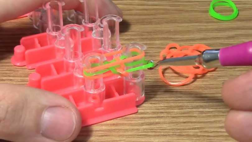 - Захватите крючком на левом столбике 2 нижние резинки, затем скиньте их в центр между столбиков.