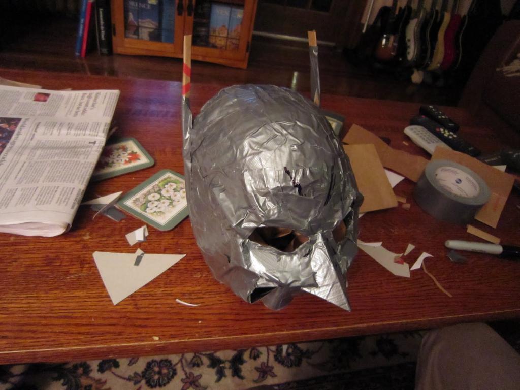 При изготовлении костюма Бэтмена своими руками обязательно сделайте маску в виде шлема. Нижняя часть лица полностью открыта, а остальная поверхность плотно облегает голову и прикрывает нос. Как сделать такой шлем? В предложенном варианте используется плотный упаковочный скотч и обычный полиэтиленовый пакет. Чтобы уберечь волосы ребенка от прилипания к клеевой стороне скотча, на голову туго натягивают пакет до уровня ноздрей.