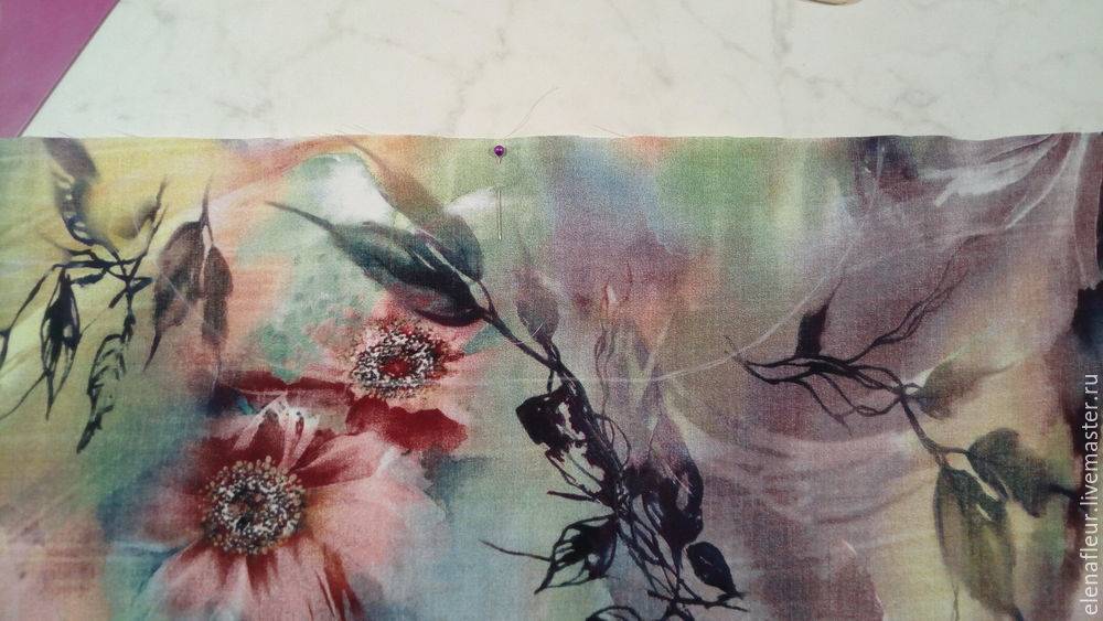 - В таком положении закрепить материю по краям булавками или прищепками, иначе вырезать горловину ровно вряд ли получится – шифон будет скользить.
