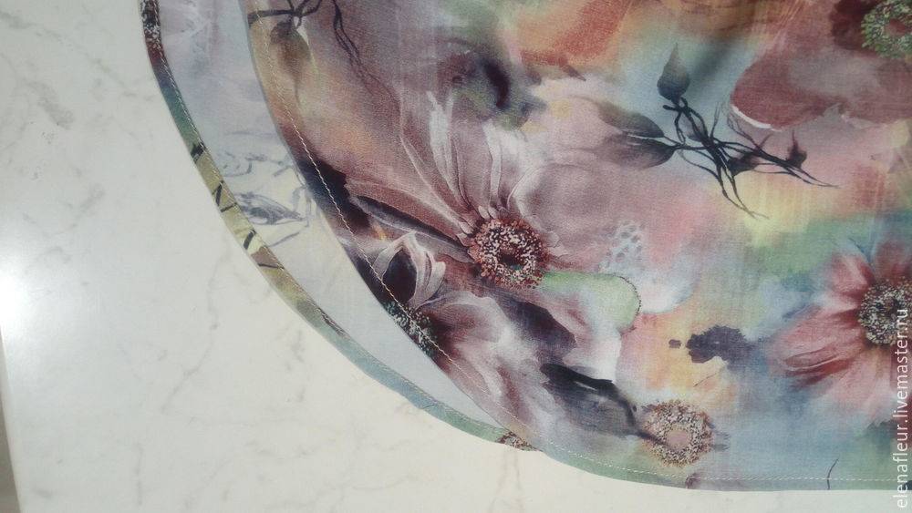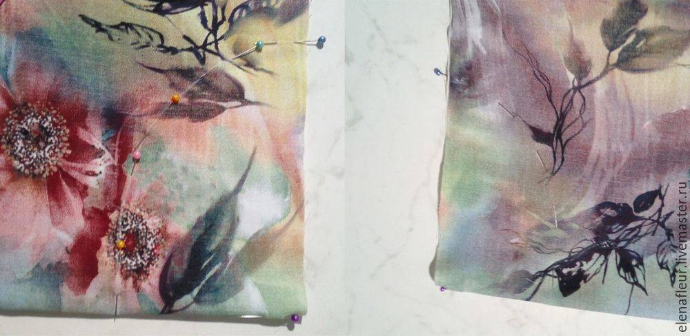 - Каждую сторону отреза нужно обрабатывать таким образом по очереди, иначе в уголках соберется шифон, который будет сложно убрать после сшивания.