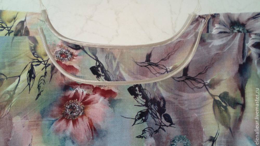 Прокладываем по линии строчку. Это сделать желательно, но не обязательно, так как ткань тонкая, легко растягивается во время дальнейшей обработки. Вырезаем горловину, отступив 3 мм от шва.