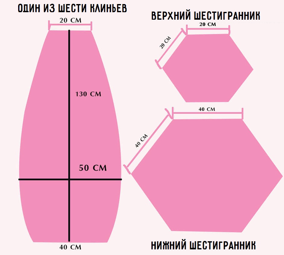 Также на нужны верх и основание кресла. Для этого нам понадобятся два шестигранника со сторонами 20 (для верха) и 40 см. (для низа). Клинья мы прошиваем между собой по боковым линиям.