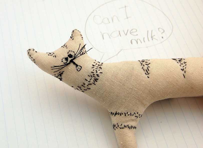 Для детей совместное шитье мягких игрушек заменит развивающие игры. Снимая выкройки кошек своими руками, дайте и малышу кусок кальки, чтобы он научился копировать изображение, затем попробовал вырезать его безопасными ножницами. Покажите, как вдевается нитка в иголку. А набить сшитую игрушку синтепоном – занятие безопасное, интересное, упражняющее ловкость и моторику рук.