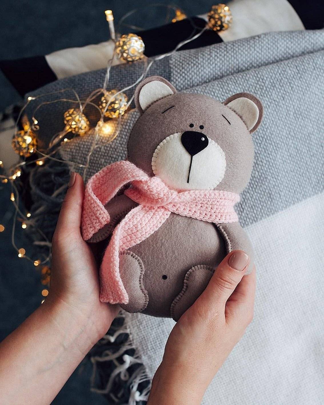 - Прежде чем приступить к пошиву фетрового медведя, необходимо найти выкройку. Ее можно придумать самостоятельно или скачать из интернета и распечатать на принтере. Это относится и к мультипликационным героям. Например, мимимишки из фетра. Любого героя популярного мультфильма можно срисовать с экрана и разрезать рисунок на детали.