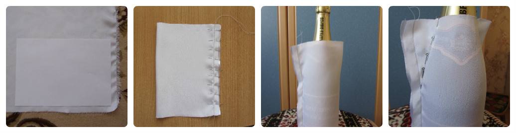 - По контуру выкройку прикладывают к материи. Чехол для бутылки «невесты» выкраивают на белом бархате, для шампанского «жениха» — на черном.