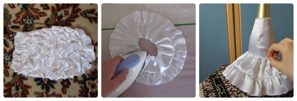 В момент, когда уже вся бутылка обклеена, и осталось несколько сантиметров широкого дна, бейку можно наклеить ровно одним сплошным лоскутом. На самый низ бутылки нужно надеть кружевной бант на резинке. Резинка должна быть крепкой, чтобы подол платья не слетал. Такой подол можно либо сделать самостоятельно, либо просто надеть красивую кружевную резинку и украсить ее золотой оборкой. Но для того, чтобы подол не спадал, ее нужно прикрепить к бейке нитью, это может быть прозрачная нить либо такого цвета, что ее не будет заметно.
