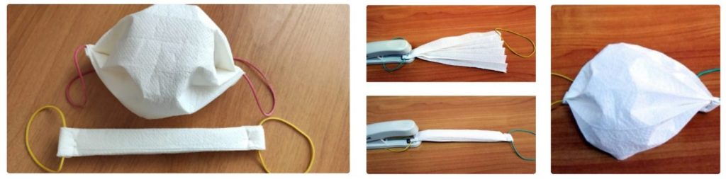 Маска одноразовая на скорую руку изготовляется вообще из бумажных полотенец, салфеток или носовых платочков в несколько слоев. Ее и шить не надо: по нужному размеру материал складывается гармошкой, складки фиксируются металлическими скобками с помощью степлера, также прикрепляются по бокам резинки. Но носить такую маску не рекомендуется больше получаса.
