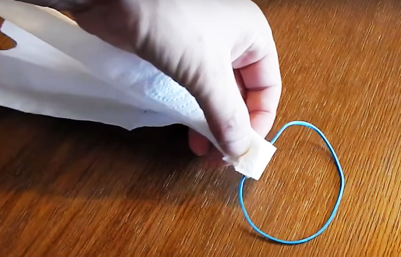 - Отрезаем два куска резинки (6-7 см), завязываем кончики, чтобы получилось колечко (можно пользоваться канцелярскими резинками);
