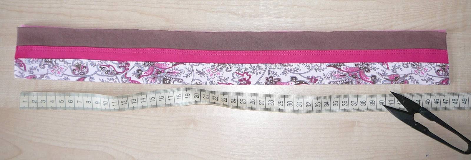 Загните изделие по краю и прошейте тут. Сзади нужно отогнуть на 3 см, чтобы можно было затем вставить сюда резинку на длину 6 см. Ее кончики вы зафиксируйте, пришив их.