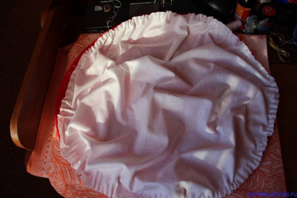 Приступаем к обработке внутренней части изделия. Для этого немного присбариваем ткань белого цвета по периметру, как показано на фото ниже.